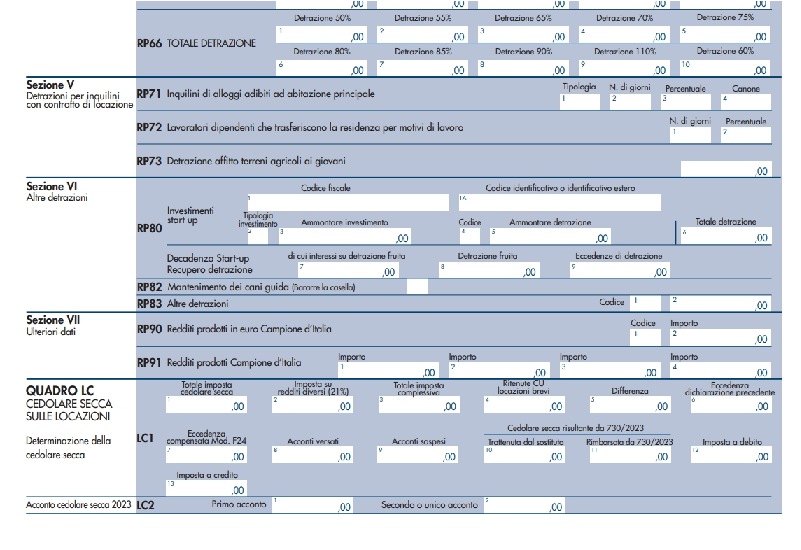 Per il quadro LC è necessario fornire dettagli precisi, come l’importo dell’imposta della cedolare secca, l’imposta sui redditi diversi e le ritenute riportate nella Certificazione Unica per le locazioni brevi.