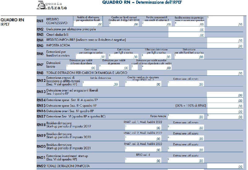 Da qui è possibile calcolare l’eventuale imposta a debito o a credito, tuttavia è necessario considerare anche quali sono gli acconti eventualmente già versati e le ritenute d’acconto. Per calcolare l’Irpef si va a compilare quindi il Quadro RN, in relazione all’anno di imposta di riferimento.